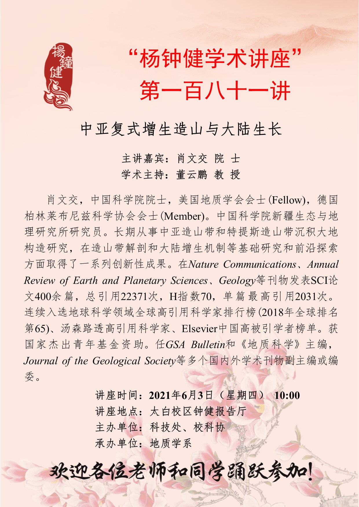 “杨钟健学术讲座”第一百八十一讲:中亚复式增生造山与大陆生长