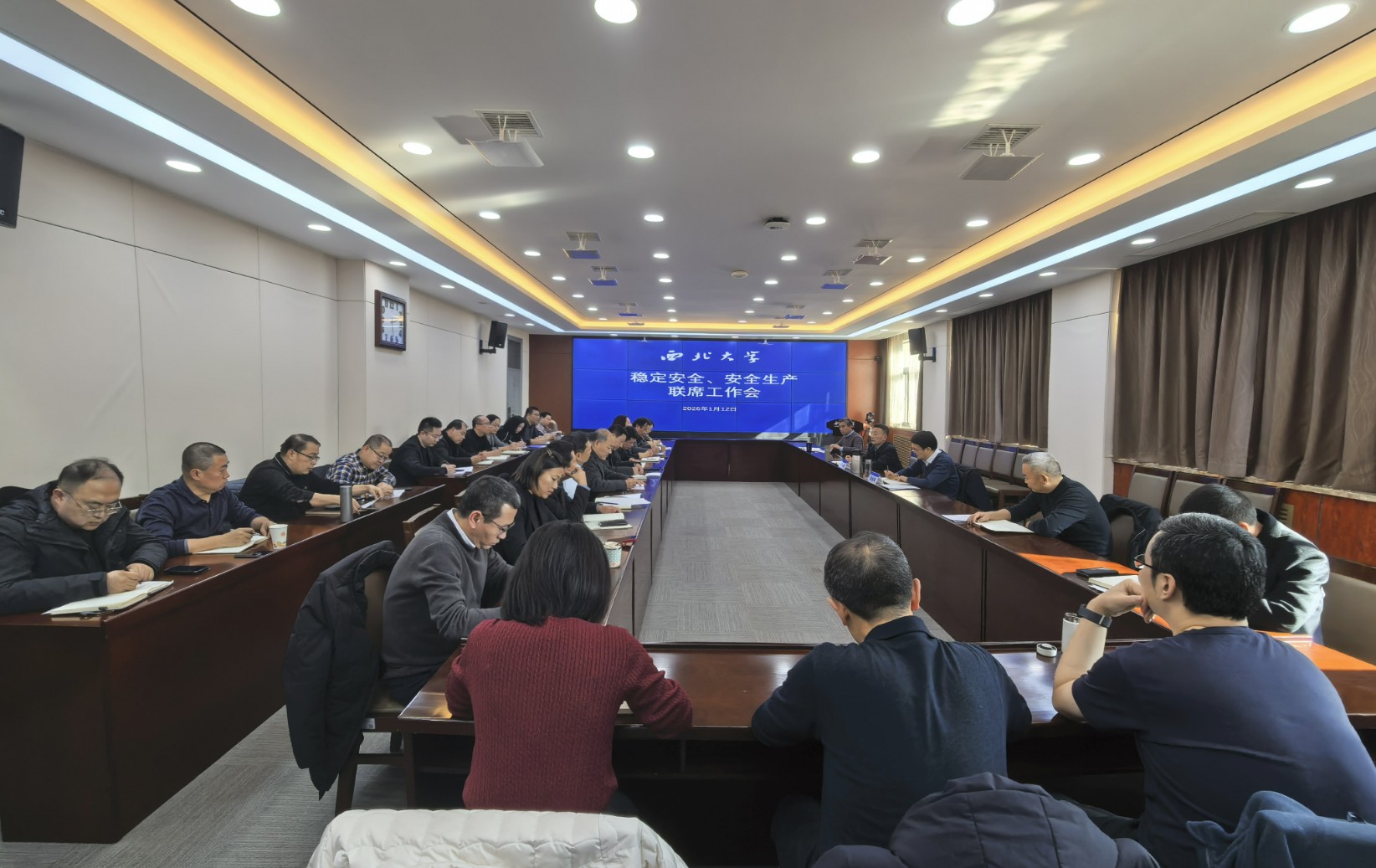 1月12日,学校在长安校区召开稳定安全、安全生产联席工作会,传达学习上级最新文件精神,分析研判各类风险隐患,安排部署假期前后相关工作。校党委副书记张远军,稳定安全办公室成员单位负责人、安全生产委员会成员单位负责人、新村改造办负责人参加会议。会议由校党委副书记赵作纽主持。