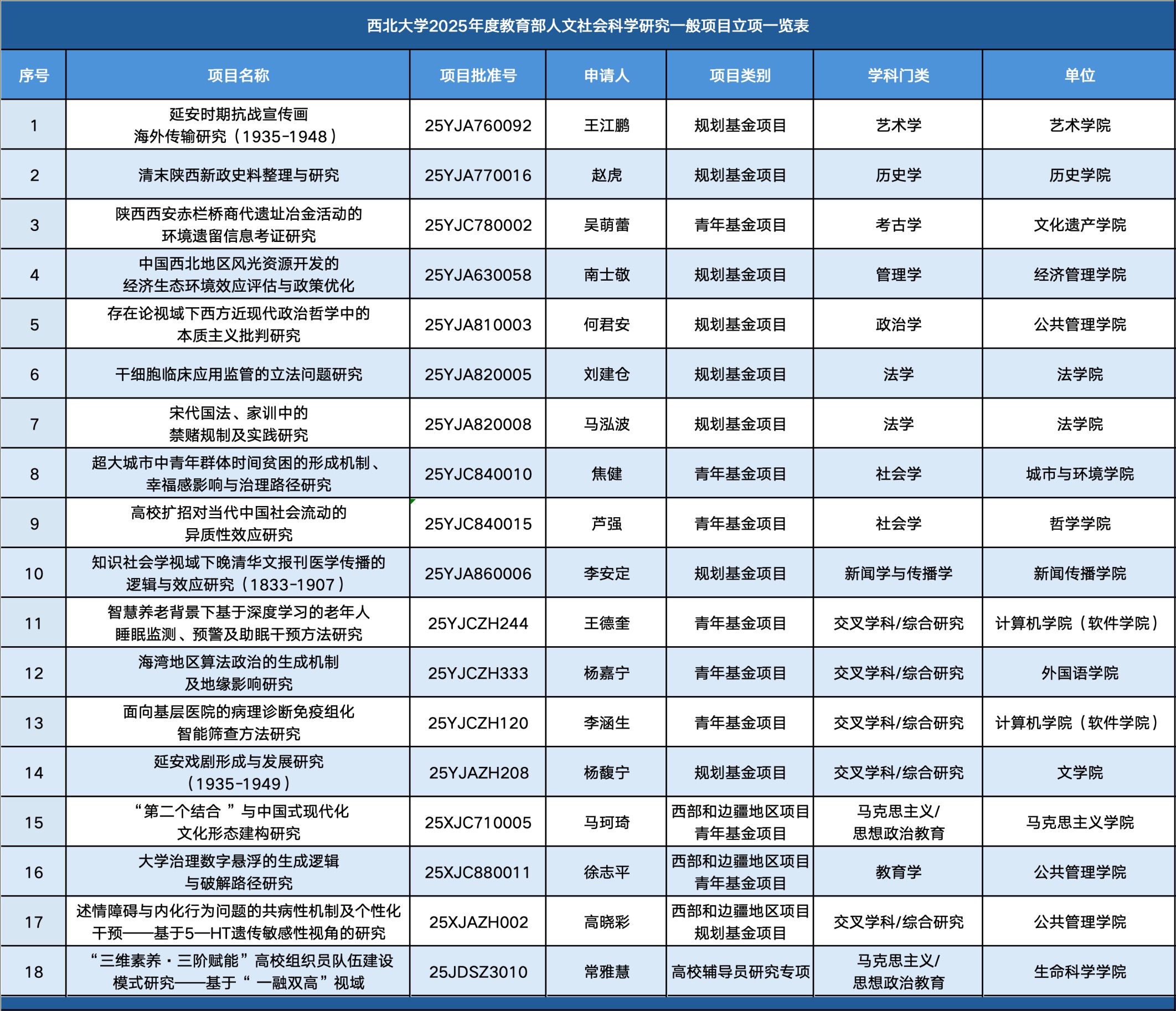 本次立项的项目中,交叉学科/综合研究5项,法学、社会学、马克思主义/思想政治教育各2项,艺术学、历史学、考古学、管理学、政治学、新闻学与传播学、教育学各1项。