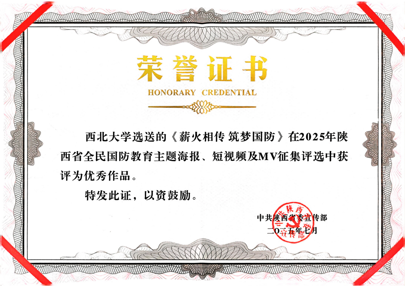 近日,由中共陕西省委宣传部组织的“2025年陕西省全民国防教育主题海报、短视频及MV征集评选”结果揭晓,金沙官网选送的作品《薪火相传筑梦国防》获评“优秀作品”。
