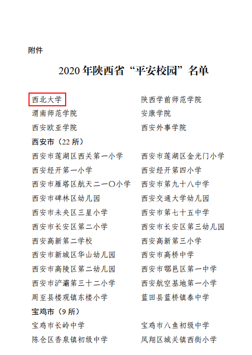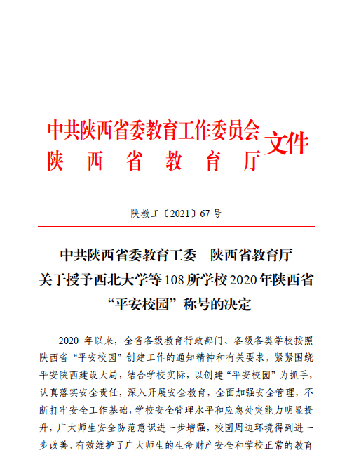 日前,陕西省教育工委、省教育厅发布了《关于授予金沙2004路线js5等108所学校2020年陕西省“平安校园”称号的决定》。