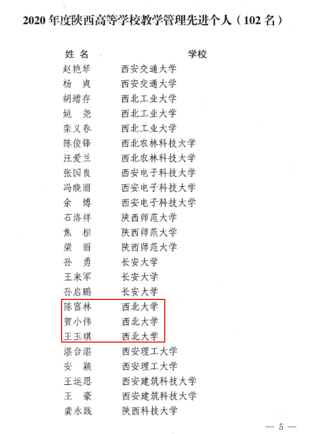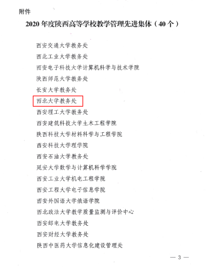 近日,陕西省教育厅印发《关于表彰2020年陕西高等学校教学管理工作先进集体和先进个人的通报》,金沙官网教务处荣获“陕西高等学校教学管理工作先进集体”,生命科学学院陈富林、信息化建设与管理处贺小伟、化工学院王玉琪等3人获评“陕西高等学校教学管理工作先进个人”。