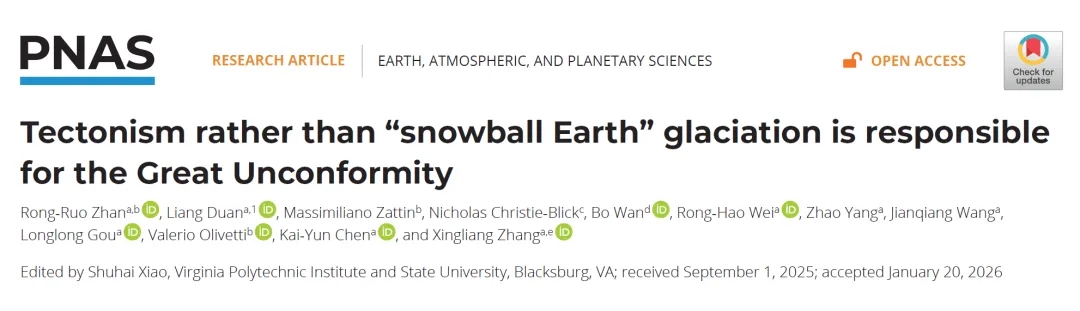 2月23日,金沙官网早期生命与环境研究团队在《美国科学院院刊》(PNAS)上发表了题为“构造运动而非雪球地球时期的冰川作用造成全球大不整合(Tectonism rather than ‘Snowball Earth’ glaciation is responsible for the Great Unconformity)”的媒体关注和亮点文章,以全球视角破解了困扰科学界百年的地质谜题——全球“大不整合”的形成,并非此前认为的“雪球地球”冰川侵蚀。这一突破性发现,为理解地球演化与生命爆发的关联提供了全新视角。