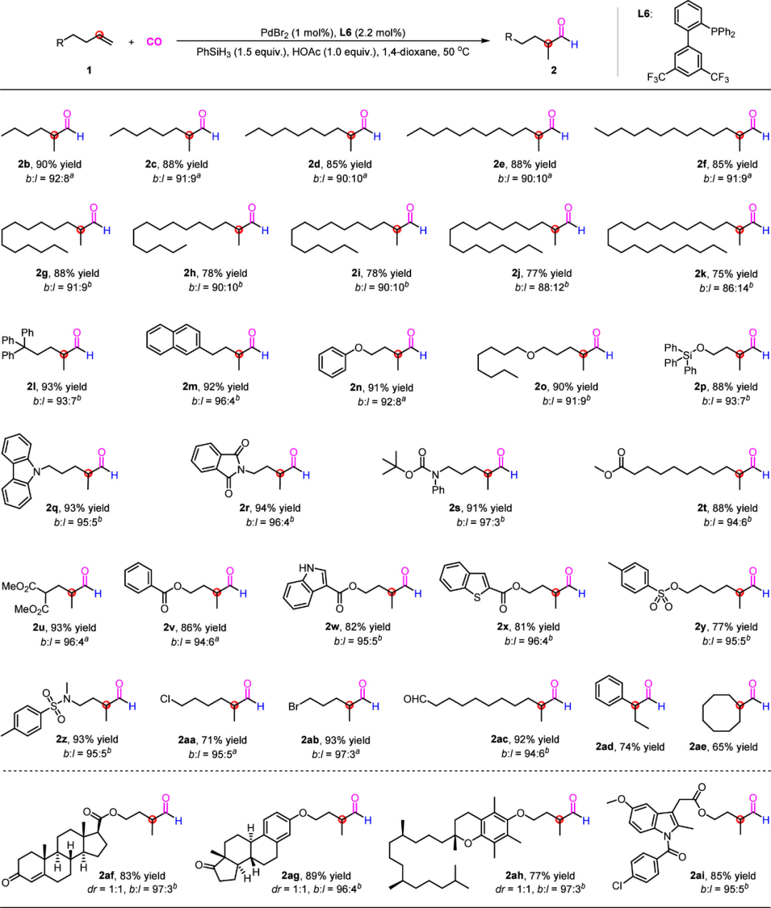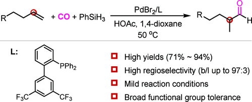 近日,金沙官网羰基化合成研究团队构建了一种钯催化烯烃的马氏氢甲酰化反应,成功突破传统烯烃氢甲酰化反应的区域选择性限制,实现了支链醛的高效合成。