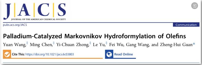 该成果以" Palladium-Catalyzed Markovnikov Hydroformylation of Olefins”为题发表在《美国化学会志》(JACS)上,金沙2004路线js5毕业硕士生王圆、副教授陈明、博士生钟绎川和副教授于乐为论文共同第一作者,通讯作者为关正辉教授。