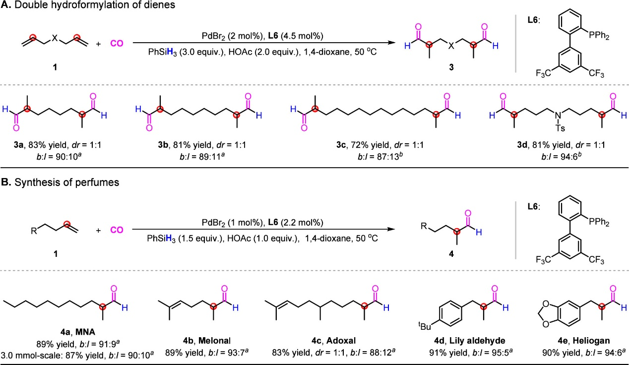 在最优条件下,1-己烯、1-辛烯、1-癸烯等烯烃均可高效转化为对应的支链醛,产率高达94%,支链选择性高达97%。反应对醚、硅醚、酯、酰胺、卤素、吲哚、咔唑等官能团均表现出良好的兼容性。该体系还适用于内烯及复杂分子骨架,并可拓展至二烯底物,实现支链二醛的高效构建。此外,该方法成功应用于多种香料分子的合成,如2-甲基癸醛(甜橙香味)、甲基壬基乙醛(脂蜡香味)、甜瓜醛(甜瓜清香味)、铃兰醛(百合香味)、兔耳草醛(紫丁香味)、阿道克醛(玫瑰香味)、新洋茉莉醛(多功能香料)等,部分底物可实现放大反应且保持高选择性。