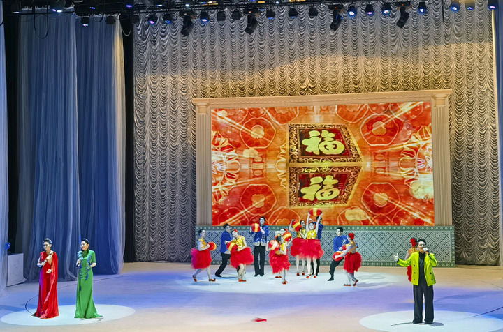 2024年2月5日,杭州歌剧舞剧院演员在土库曼斯坦阿什哈巴德举行的“中国文化年”闭幕式文艺演出上表演歌舞《欢乐中国年》。新华社记者 江宥林 摄