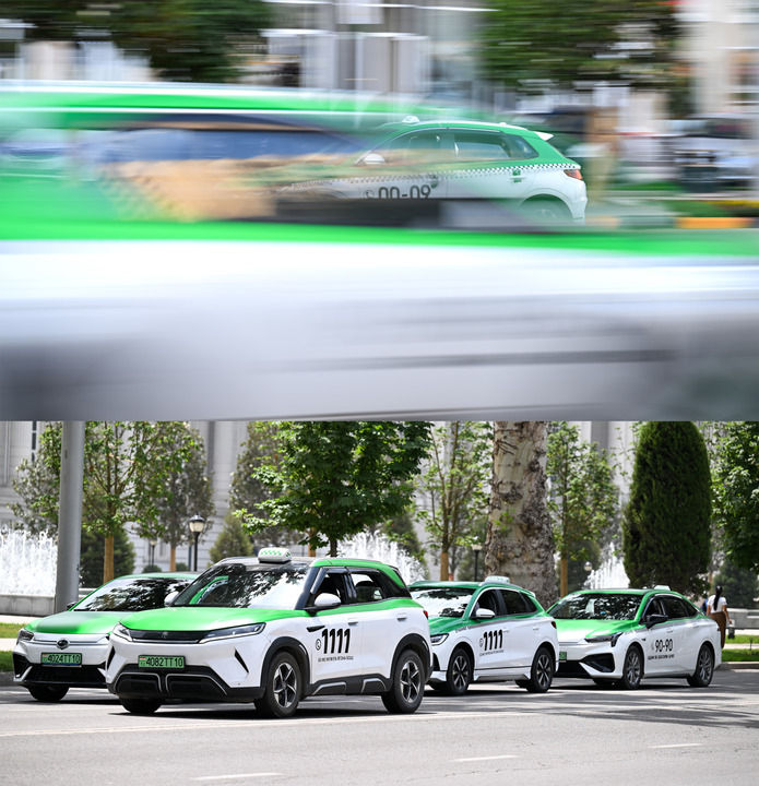 在塔吉克斯坦首都杜尚别,中国新能源汽车行驶在道路上(拼版照片,上图摄于2025年5月28日,下图摄于2025年5月29日)。新华社记者 李任滋 摄