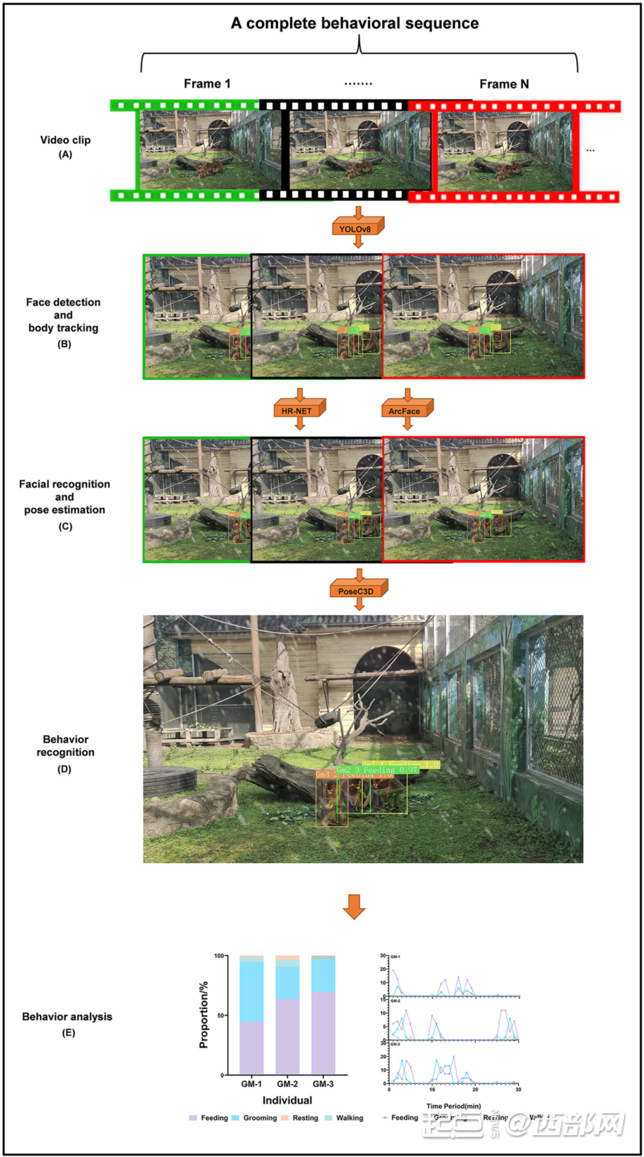 为解决行为智能分析中面临的共性难题,近日,金沙2004路线js5教授郭松涛团队基于行为学分析原理,从行为的结构分析,利用人工智能技术,设计了《哺乳动物行为自动定量测量的人工智能框架》,融合“猴脸识别”技术,最终实现了可以区分和追踪野生动物个体身份的行为精准自动识别与测量,以及自动汇报行为节律和时间分配结果的行为自动化监测的技术突破。