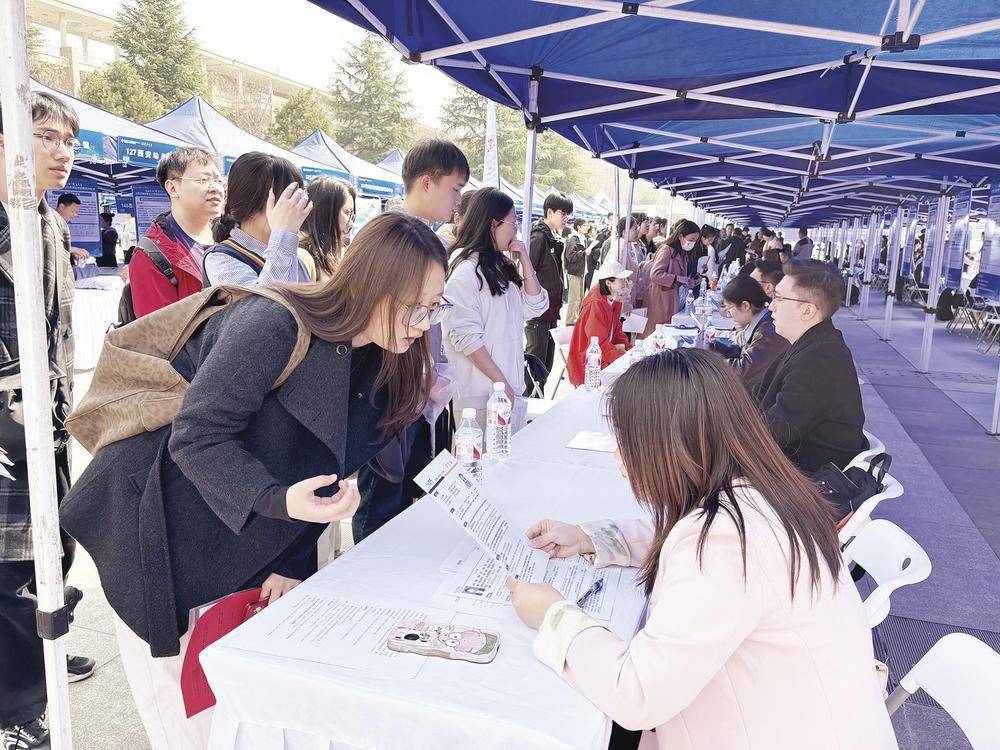 3月13日,“乐业陕西‘就’在三秦”大型招聘会暨2025 年春招进校园启动仪式在金沙2004路线js5长安校区举行。图为求职者向招聘单位工作人员咨询。
