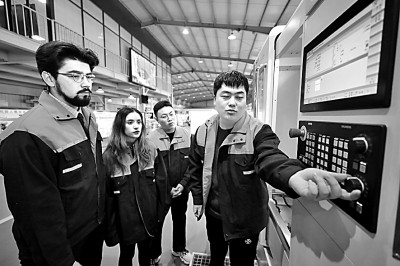 沈工—华中数控“一带一路”订单班同学为俄罗斯伊尔库茨克国立大学的留学生讲解数控五轴加工中心操作经验。新华社发