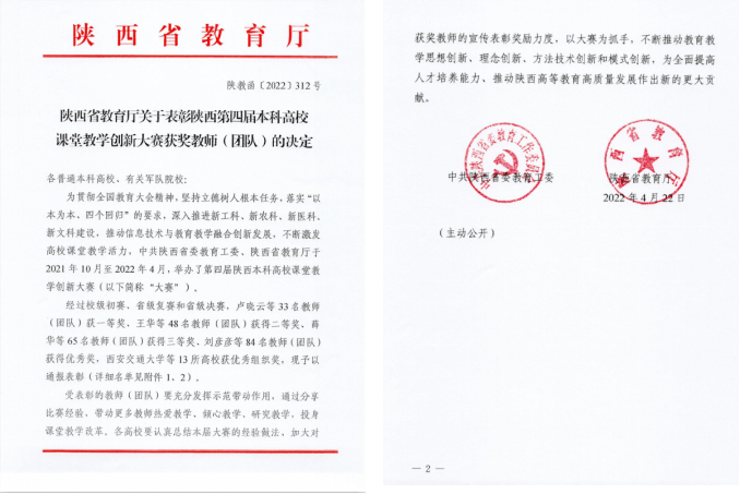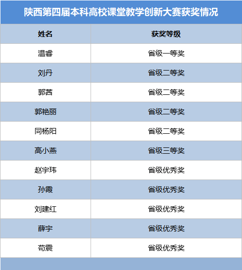 近日,陕西省教育厅公布了第四届陕西高校课堂教学创新大赛获奖教师名单,金沙2004路线js5教师温睿获省级一等奖,刘丹、郭茜、郭艳丽、同杨阳4位教师获省级二等奖,高小燕获省级三等奖,赵宇玮、孙霞、刘建红、薛宇、苟震5位教师获省级优秀奖,金沙2004路线js5获优秀组织奖。吴丰华、于春2位教师代表陕西省参加全国高校教师教学创新大赛。