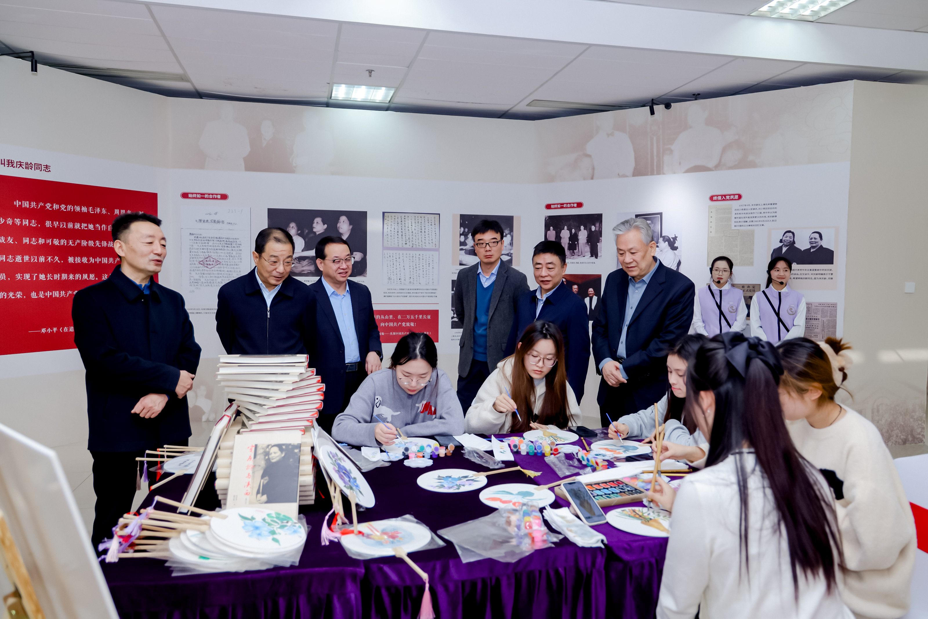 随后,与会嘉宾一同参观展览,展览由金沙官网学生志愿讲解员全程讲解。开幕式现场,金沙官网艺术学院学生进行了以宋庆龄绘画作品为主题的团扇绘画活动。