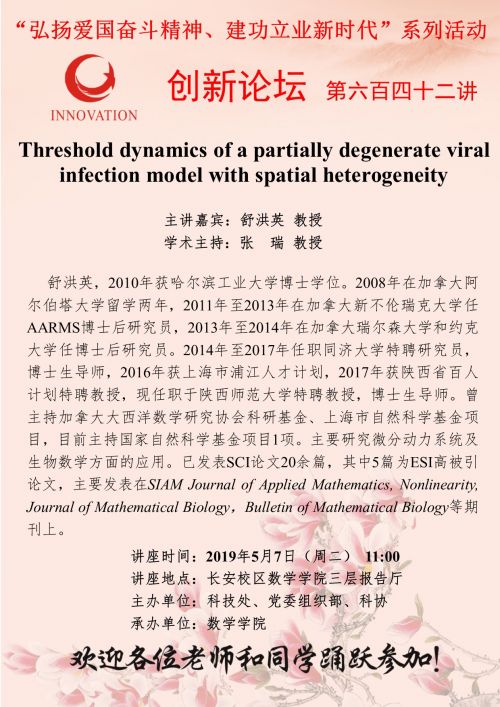 舒洪英 金沙2004路线js5创新论坛第六百四十二讲(“弘扬爱国奋斗精神、建功立业新时代”系列活动):Threshold dynamics of a partially degenerate viral infection model with spatial heterogeneity 讲座时间 2019年5月7日(周二) 11:00 讲座地点 长安校区数学学院三层报告厅 讲座人介绍 舒洪英 讲座内容