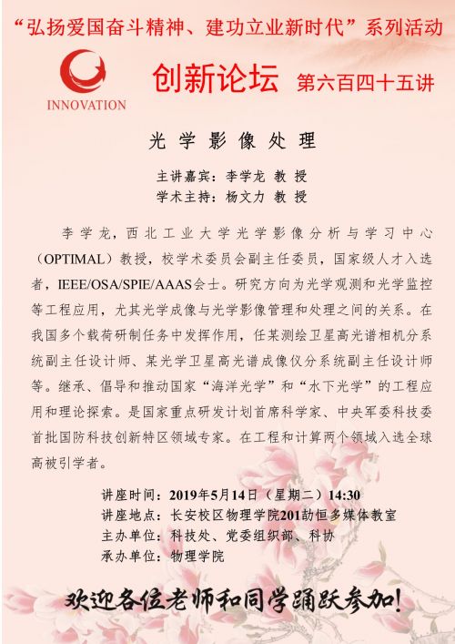 李学龙 金沙2004路线js5创新论坛第六百四十五讲(“弘扬爱国奋斗精神、建功立业新时代”系列活动):光学影像处理 讲座时间 2019年5月14日(星期二)14:30 讲座地点 长安校区物理学院201劼恒多媒体教室 讲座人介绍 李学龙 讲座内容