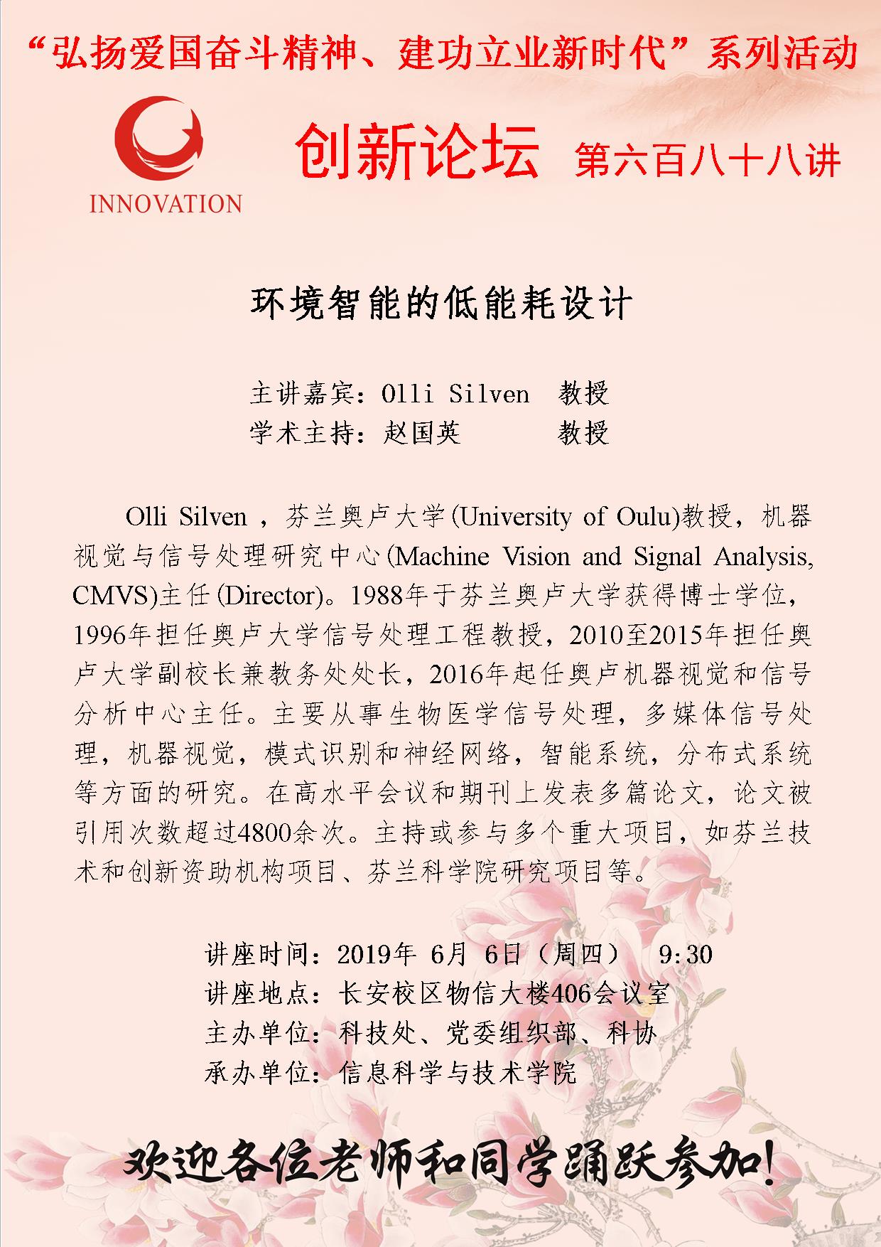 Olli Silven 金沙2004路线js5创新论坛第六百八十八讲(“弘扬爱国奋斗精神、建功立业新时代”系列活动):环境智能的低能耗设计 讲座时间 2019年 6月 6日(周四) 9:30 讲座地点 长安校区物信大楼406会议室 讲座人介绍 Olli Silven 讲座内容