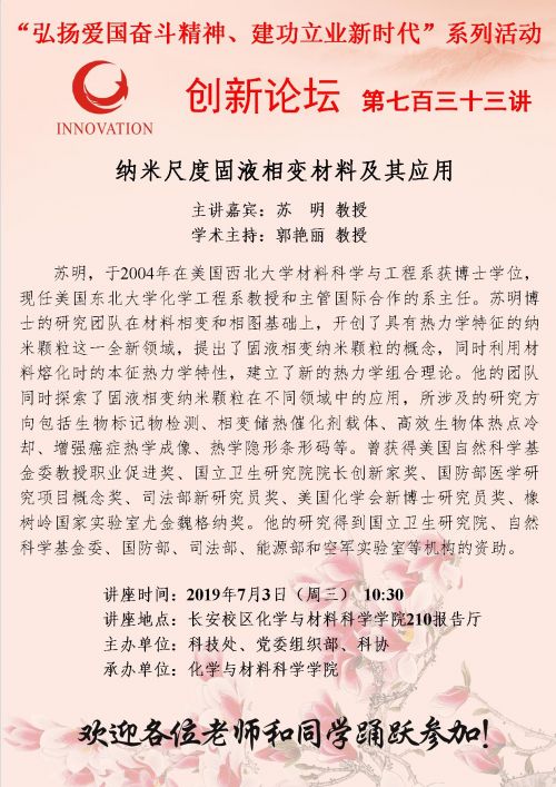 苏 明 金沙2004路线js5创新论坛第七百三十三讲(“弘扬爱国奋斗精神、建功立业新时代”系列活动):纳米尺度固液相变材料及其应用 讲座时间 2019年7月3日(周三) 10:30 讲座地点 长安校区化学与材料科学学院210报告厅 讲座人介绍 苏 明 讲座内容