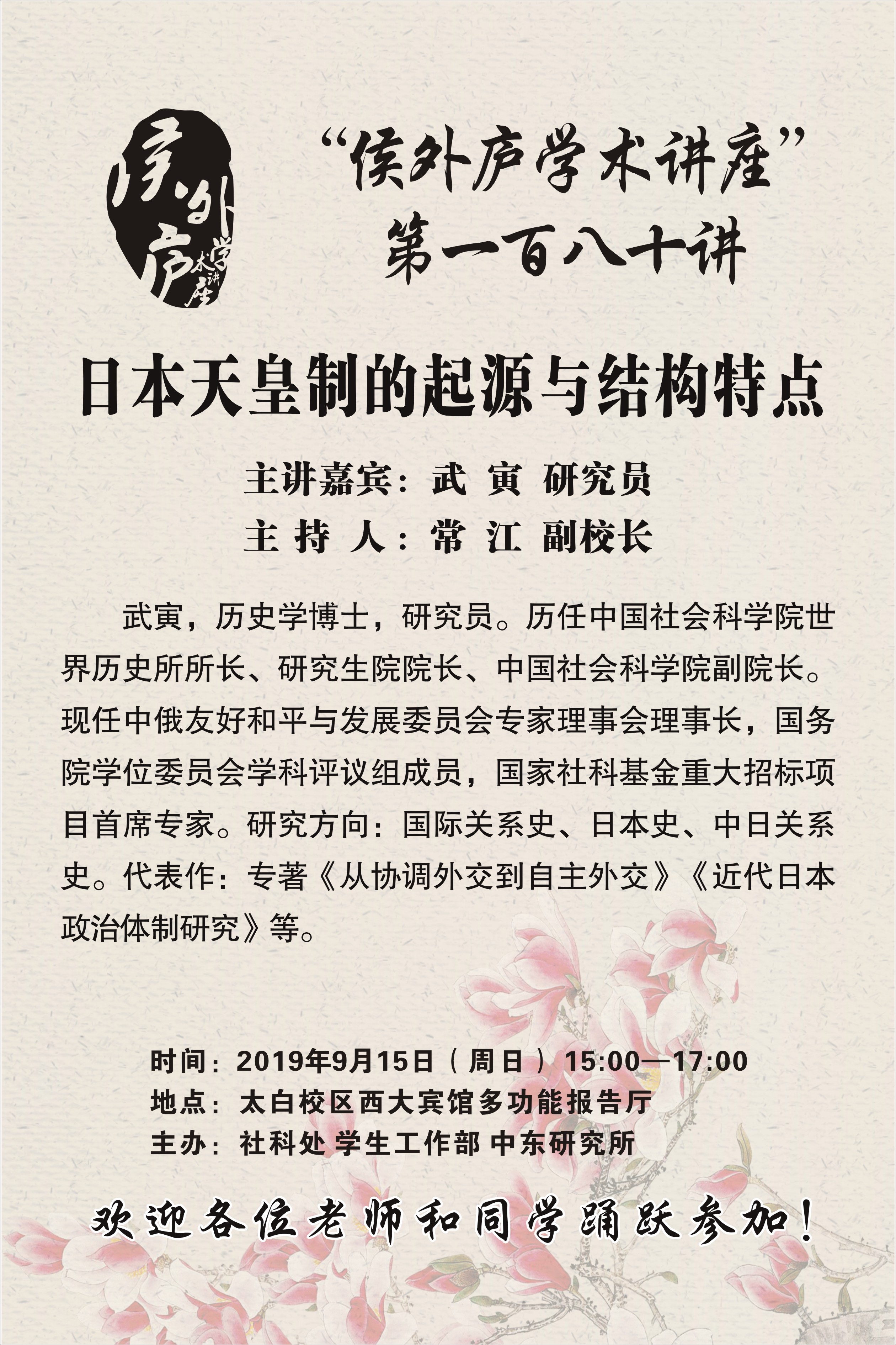 武 寅 研究员 “侯外庐学术讲座”第一百八十讲:日本天皇制的起源与结构特点 讲座时间 2019年9月15日(周日) 15:00—17:00 讲座地点 太白校区西大宾馆多功能报告厅 讲座人介绍 武 寅 研究员 讲座内容