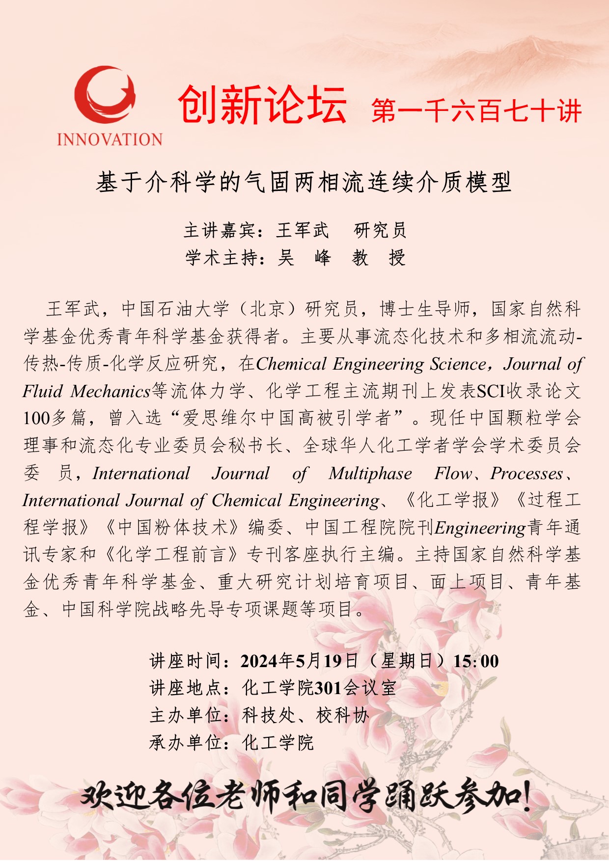 王军武 研究员 金沙2004路线js5创新论坛第一千六百七十讲:基于介科学的气固两相流连续介质模型 讲座时间 2024年5月19日(星期日)15:00 讲座地点 化工学院301会议室 讲座人介绍 王军武 研究员 讲座内容
