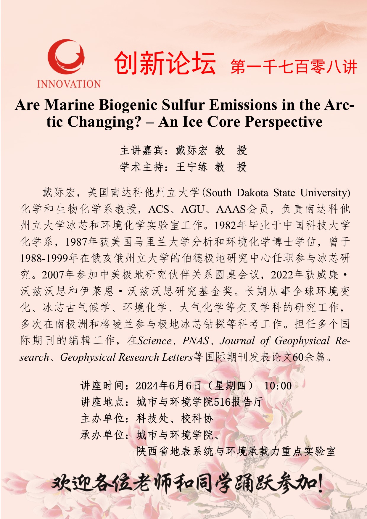 戴际宏 教授 金沙2004路线js5创新论坛第一千七百零八讲:Are Marine Biogenic Sulfur Emissions in the Arctic Changing? – An Ice Core Perspective 讲座时间 2024年6月6日(星期四) 10:00 讲座地点 城市与环境学院516报告厅 讲座人介绍 戴际宏 教授 讲座内容