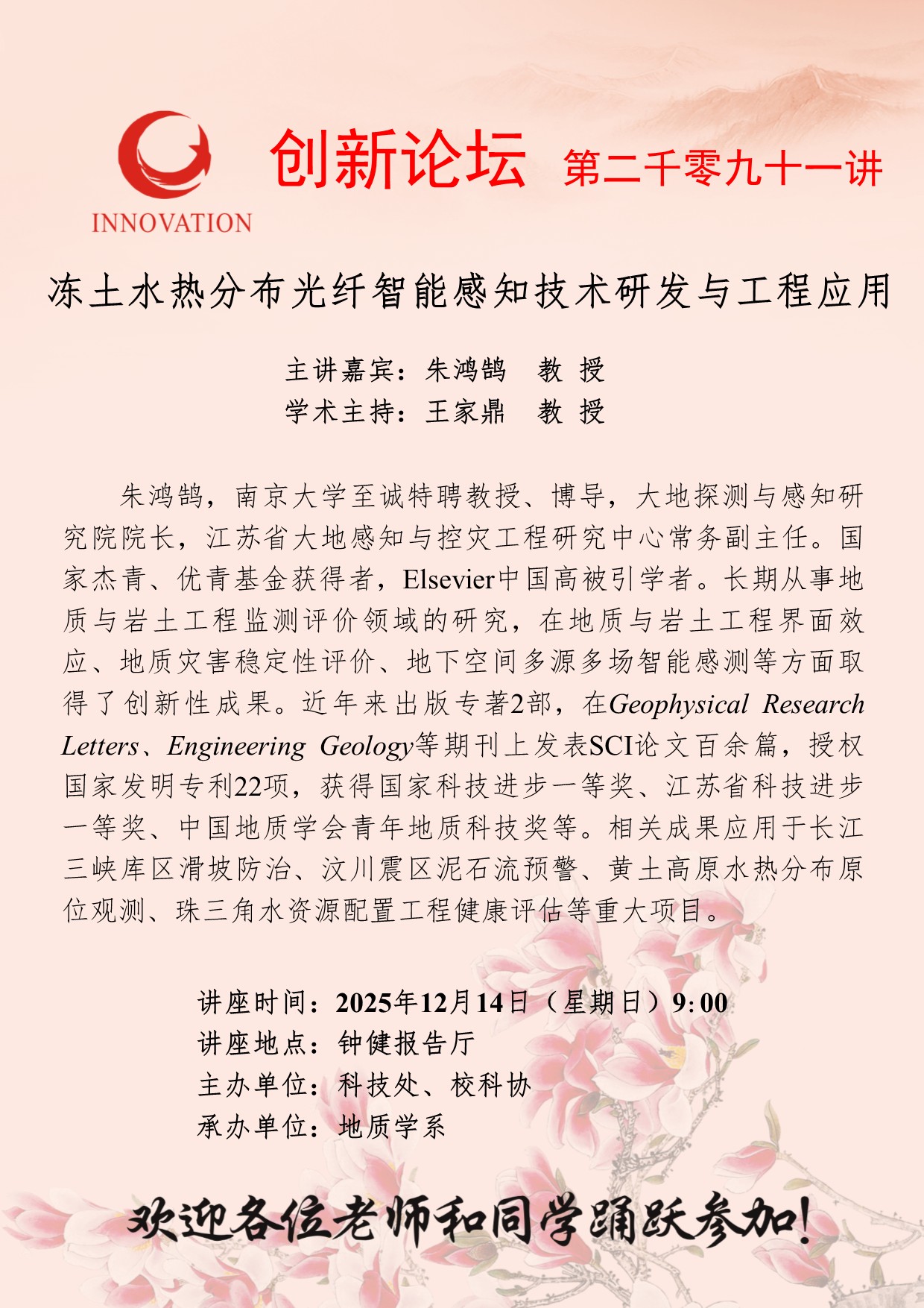 朱鸿鹄 教授 金沙2004路线js5创新论坛第二千零九十一讲:冻土水热分布光纤智能感知技术研发与工程应用 讲座时间 2025年12月14日(星期日)9:00 讲座地点 钟健报告厅 讲座人介绍 朱鸿鹄 教授 讲座内容