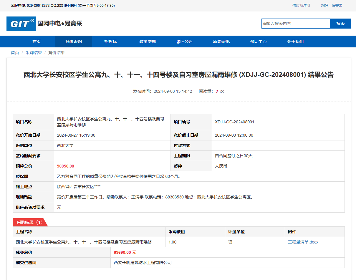金沙2004路线js5长安校区学生公寓九、十、十一、十四号楼及自习室房屋漏雨维修 (XDJJ-GC-202408001) 竞价结果公告 作者: 编辑: 时间:2024-09-03 原公告链接:https://www.ejingcai.com.cn/site/bidding/detail/12306