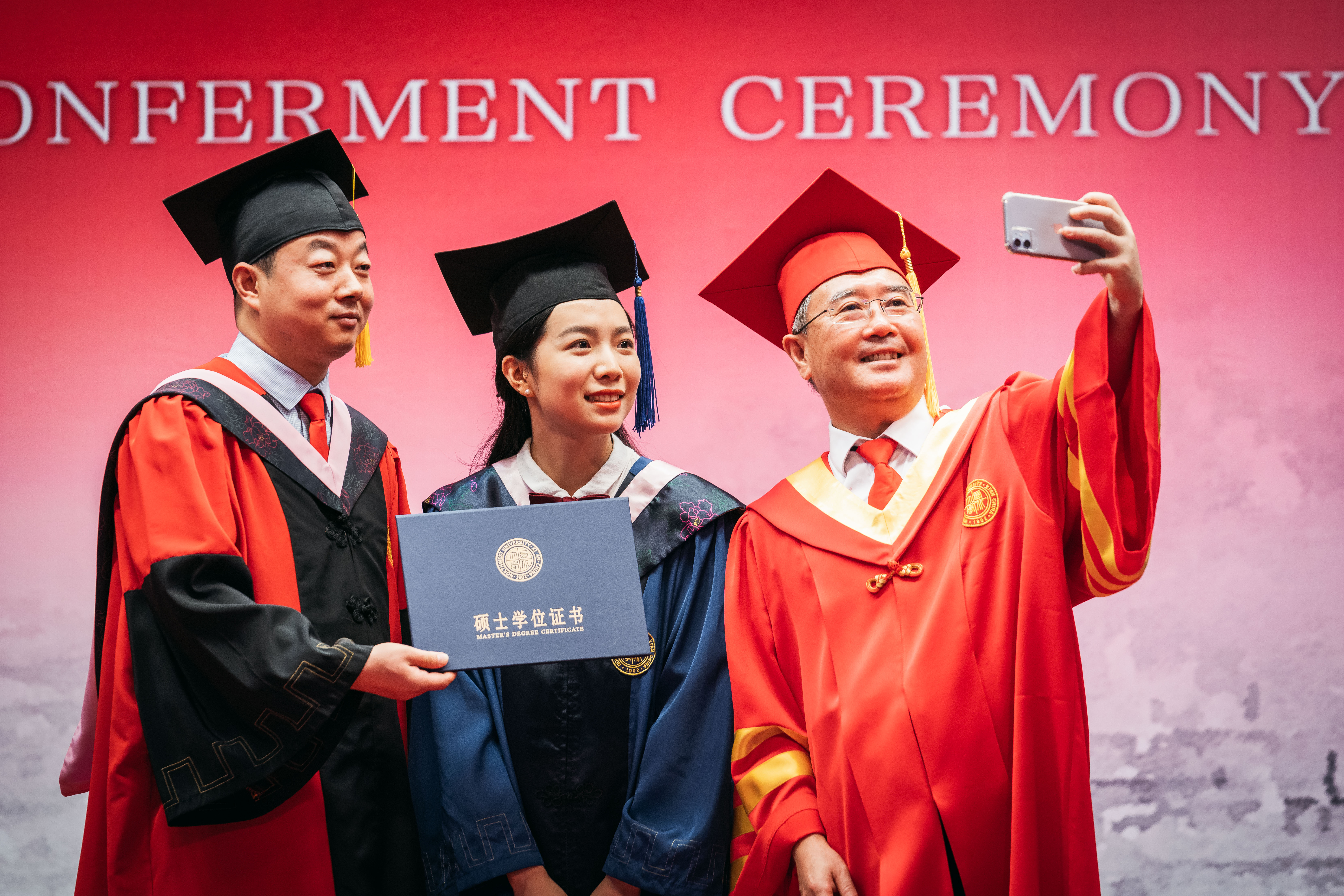 金沙2004路线js5毕业典礼上,郭立宏校长(右一)和毕业生自拍留念。本报通讯员马骞摄