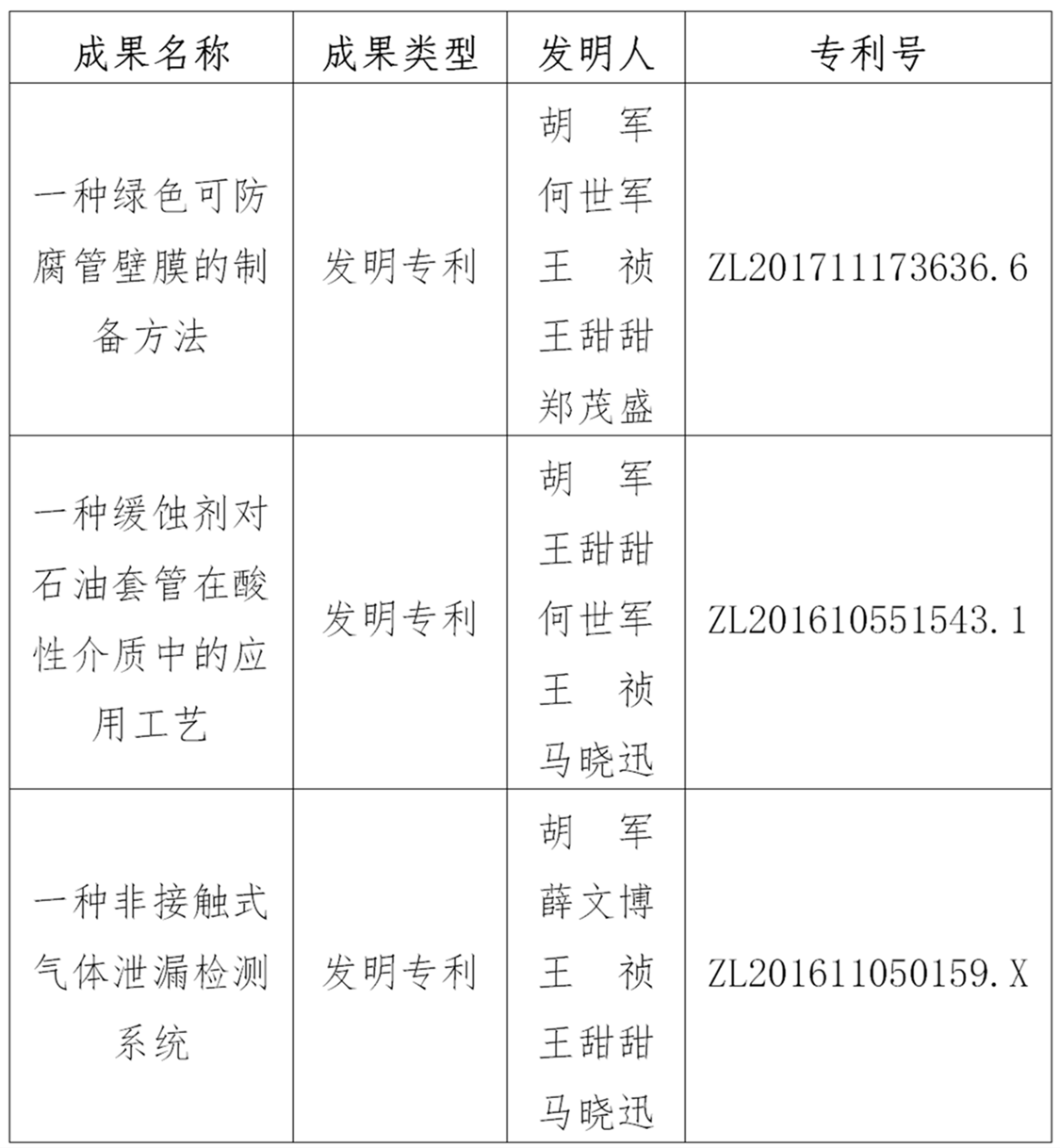 2. “一种缓蚀剂对石油套管在酸性介质中的应用工艺”;3. “一种非接触式气体泄漏检测系统”。
