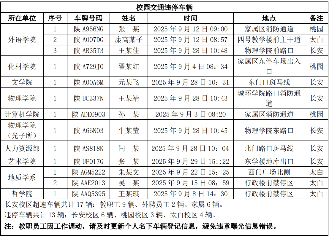 为进一步加强校园交通管理,保障校园交通安全有序,维护学校正常的教学、科研和生活秩序,切实保护师生员工的人身财产安全,根据《金沙2004路线js5校园交通安全管理规定》的相关要求,现将2025年9月校园交通违章车辆予以曝光,具体要求与违章信息如下: