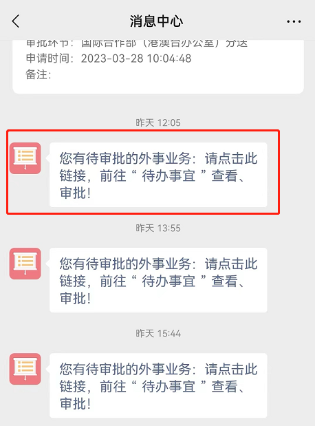 通过手机微信“金沙2004路线js5”-“消息中心”-“R.外事系统”路径,可以进行业务查看及审批。