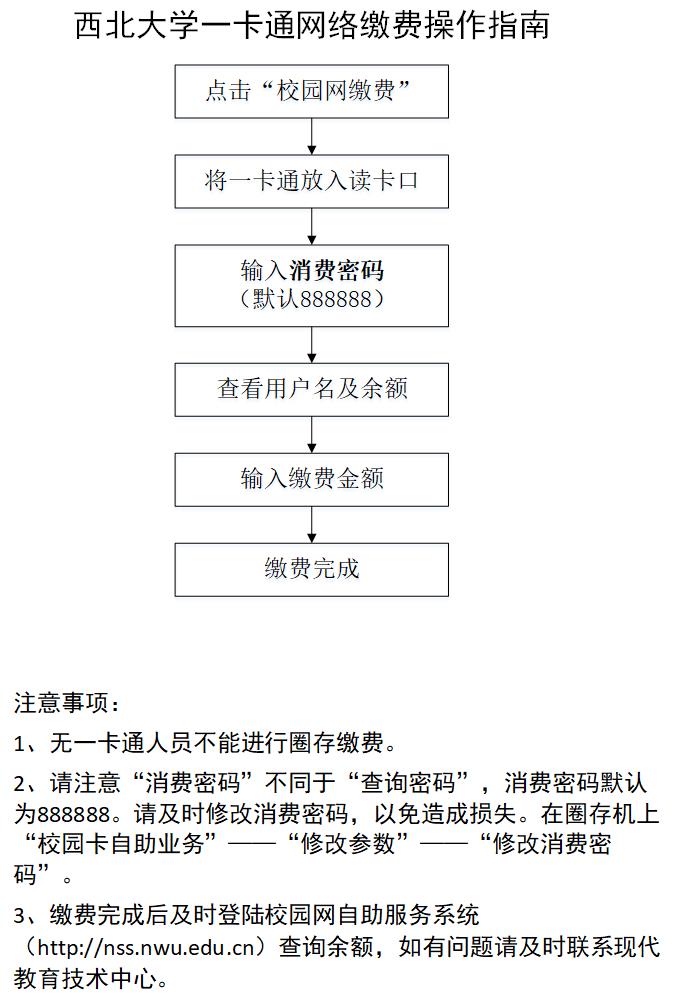 3. 缴费完成后及时登陆校园网自助服务系统(http://nss.nwu.edu.cn)或微信公众号查询余额,如有问题请及时联系现代教育技术中心88308813。