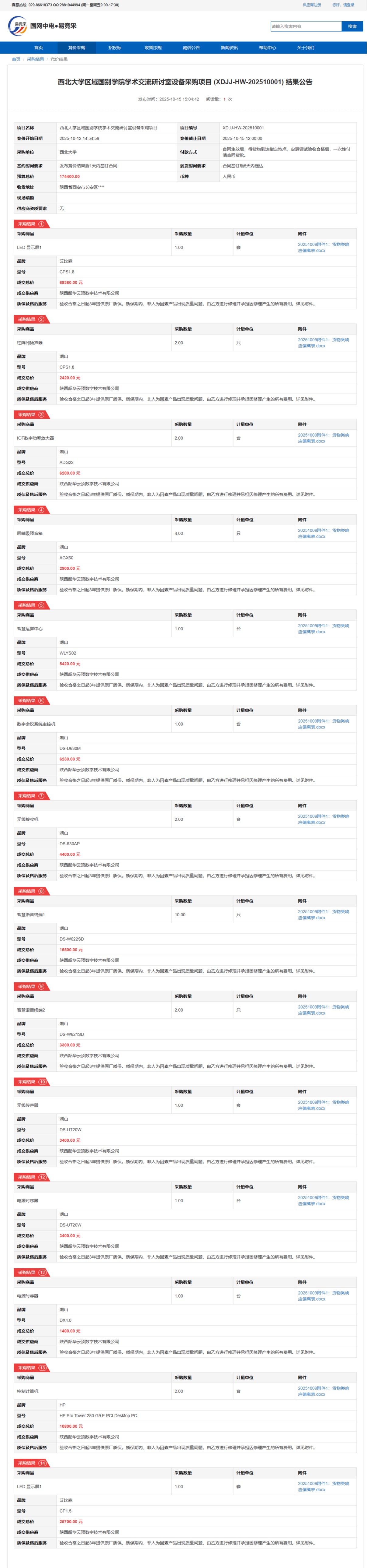 金沙2004路线js5区域国别学院学术交流研讨室设备采购项目(XDJJ-HW-202510001)竞价结果公告