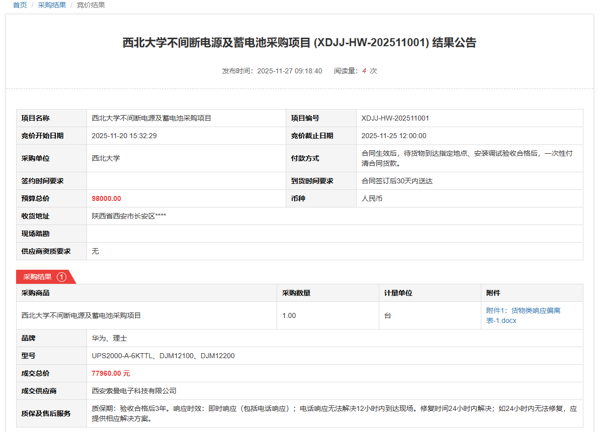 金沙2004路线js5不间断电源及蓄电池采购项目(XDJJ-HW-202511001)竞价结果公告